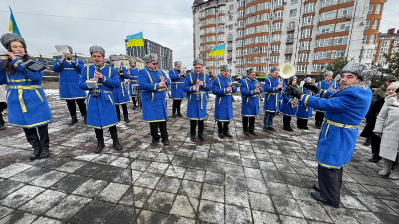 Музичний колектив на пам’ятному вічі на честь Степана Бандери в Івано-Франківську, 1 січня 2026 року. Суспільне Івано-Франківськ/Ігор Попик