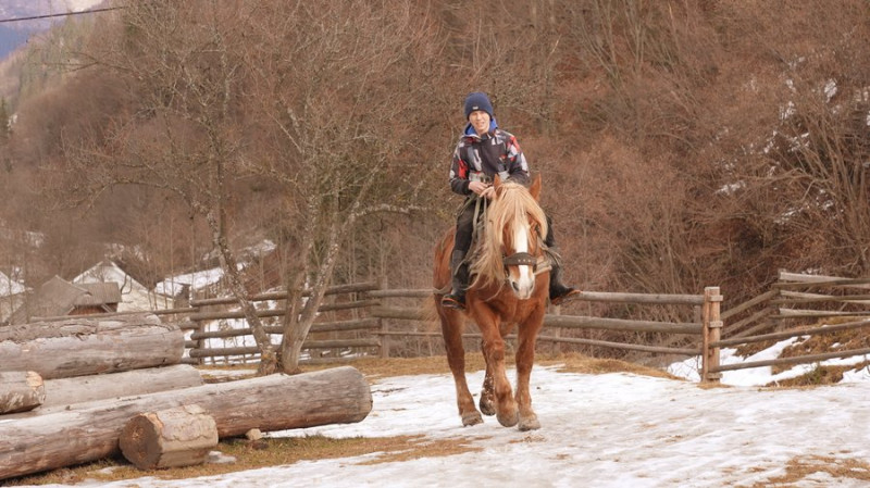 У морози до горішніх присілків Гриняви не доїдеш — хіба ЗІЛом з ланцюгами на колесах. Вийти і зійти можна пішки, попри дорогу, але якщо треба в магазин, доводиться їхати конем. Верхи у Гриняві уміють їздити змалку, розповідає 13-річний Василь Рибчук, якого зустрічаємо дорогою з присілка Каптарга. Він якраз забрався на коня.