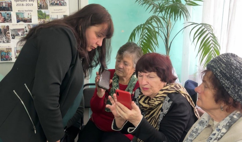 Студентка "Університету третього віку" — 78-річна Ярослава Шредер прийшла на зустріч із волонтеркою Валерією Прудніковою, яка є головою Ради внутрішньо переміщених осіб у Калуській громаді. Жінка розповіла слухачам, як користуватися смартфонами, безпечно працювати із соцмережами Facebook, Instagram і Telegram, а також про корисні програми для повсякденного життя — від календарів і нотаток до фінансових додатків.