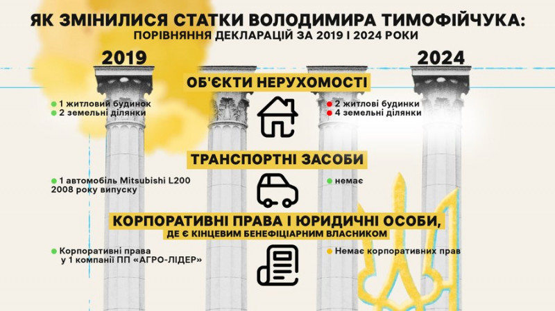 Як змінилися статки нардепа Володимира Тимофійчука з 2019 по 2024 рік. Інфографіка: Суспільне Івано-Франківськ