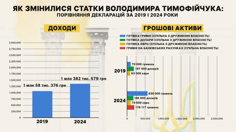 Як змінилися доходи та грошові активи Володимира Тимофійчука у 2024 році порівняно з 2019. Інфографіка: Суспільне Івано-Франківськ