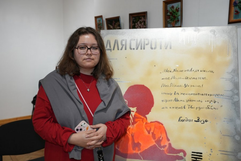 "Зображений малюнок Богдана, який став відомим після того, як його ув'язнили. Це — хлопчик-сирота, адже творчий псевдонім Богдана — Сирота. Він сирота насправді. У нього немає батьків. Брат асоціює себе з цим образом. Важливо, що мисткиня вкладає в це відповідний сенс: на її малюнках хлопчик — у помаранчевому одязі. Це — як тюремний одяг. Текст — це перший публічний лист Богдана після листа президенту, написаний в ув'язненні", — розповідає Олександра Баркова.