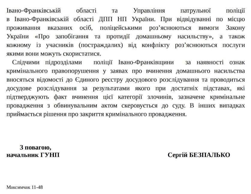 Фіртка отримала офіційну інформацію від начальника Головного управління Національної поліції в Івано-Франківській області Сергія Безпалька щодо стану справ з домашнім насильством в регіоні. Документ містить детальну статистику за 2024 рік та 10 місяців 2025 року. Ця інформація відображає реальну картину звернень до правоохоронців та підтверджених випадків.