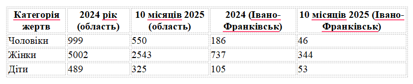 Згідно з наданими даними, у 2024 році до поліції Івано-Франківської області надійшло 6538 заяв та повідомлень про правопорушення та події, пов’язані з домашнім насильством. За 10 місяців 2025 року цей показник склав 3 289 звернень. У місті Івано-Франківську ситуація така: 1545 заяв у 2024 році проти 653 за 10 місяців 2025-го.