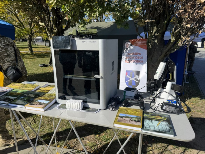 Курсантка Неля Кащенко демонструє відвідувачам 3D-принтер та зразки того, що на ньому виготовили, а також книги зі служби пально-мастильних матеріалів і спеціальних рідин, які для військовослужбовців написали викладачі кафедри військової підготовки Івано-Франківського національного технічного університету нафти і газу.