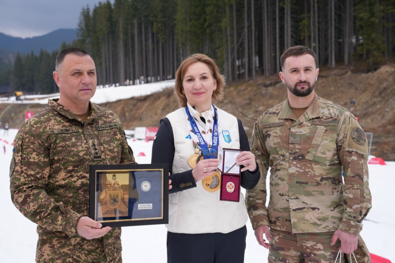Біатлоністка Олена Підгрушна отримує нагороду від військовослужбовців. Суспільне Івано-Франківськ