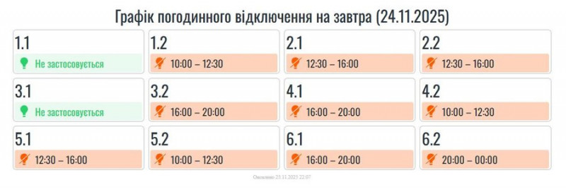 Графіки погодинних вимкнень електроенергії на Франківщині 24 листопада 2025 року. Telegram/”Прикарпаттяобленерго”