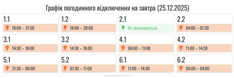 Графіки погодинних вимкнень електроенергії на Івано-Франківщині на 25 грудня. Telegram/”Прикарпаттяобленерго”