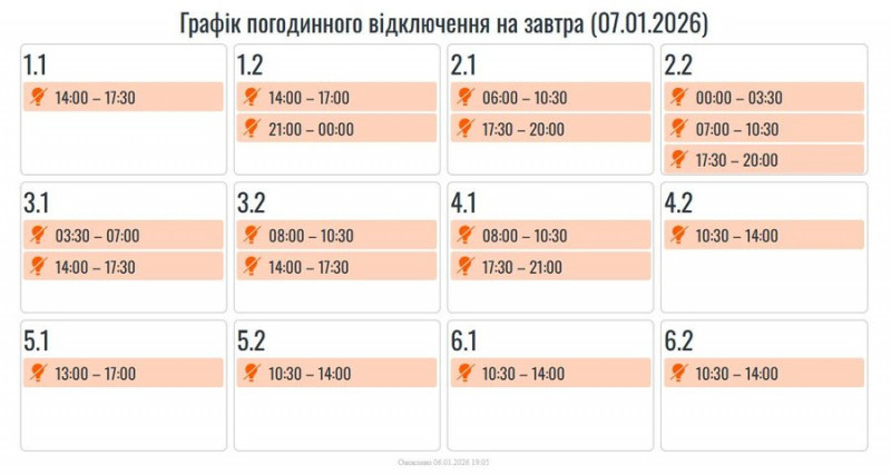 Графіки погодинних вимкнень електроенергії на Івано-Франківщині на 7 січня 2026. Прикарпаттяобленерго