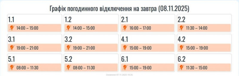 Графіки погодинних вимкнень електроенергії для споживачів на 8 листопада. Telegram/Прикарпаттяобленерго
