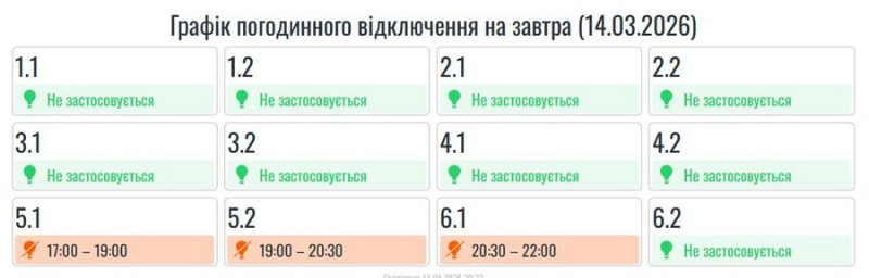 "Завтра, 14 березня, в усіх регіонах України з 17:00 до 22:00 будуть застосовуватися графіки погодинних вимкнень", — йдеться у дописі.