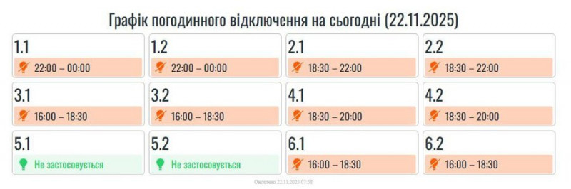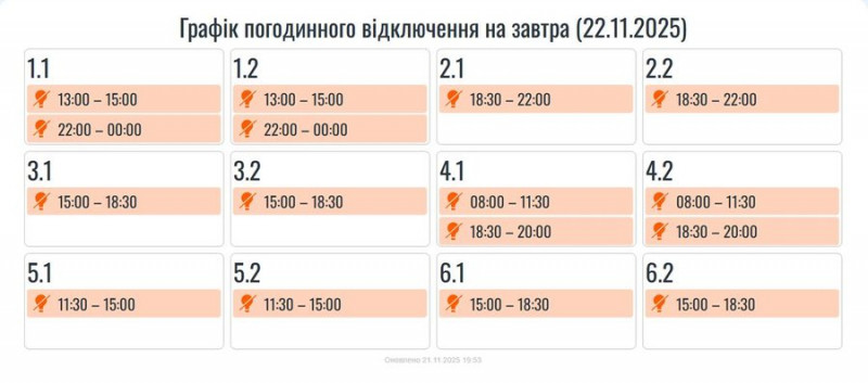 "Завтра, 22 листопада, протягом доби на території Івано-Франківської області будуть діяти ГПВ для побутових споживачів. Для промислових — протягом доби будуть діяти графіки обмеження потужності", — йдеться у дописі.