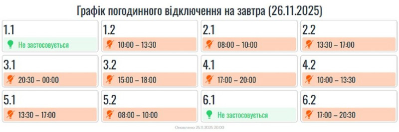 Графіки погодинних вимкнень електроенергії, що діятимуть на Івано-Франківщині 26 листопада. “Прикарпаттяобленерго”