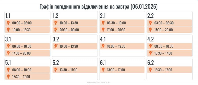 Графіки погодинних вимкнень електроенергії на Івано-Франківщині на 6 січня 2026. Прикарпаттяобленерго