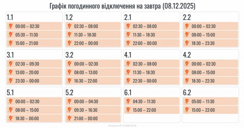 Графіки погодинних вимкнень електроенергії на Івано-Франківщині на 8 грудня 2025. Telegram/”Прикарпаттяобленерго”