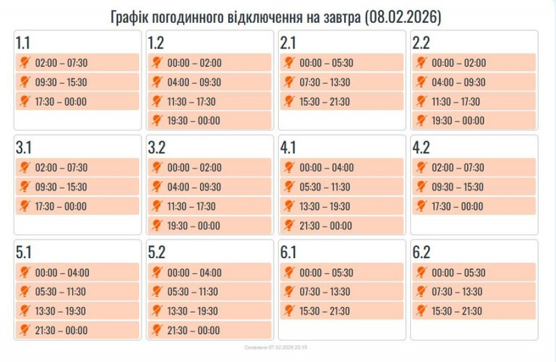 Графіки погодинних вимкнень електроенергії, що діятимуть на Івано-Франківщині 8 лютого. Telegram/Прикарпаттяоблаенерго