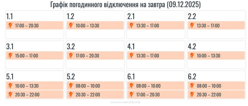 Графіки погодинних вимкнень електроенергії, що діятимуть на Івано-Франківщині 9 грудня. Telegram/Прикарпаттяоблаенерго