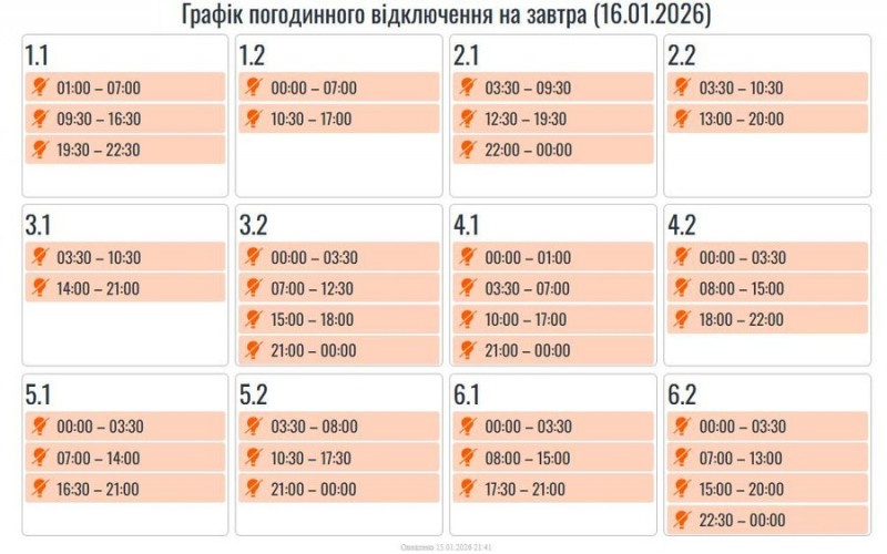 Графіки вимкнень електроенергії на Івано-Франківщині 16 січня 2026 року. Telegram/”Прикарпаттяобленерго”