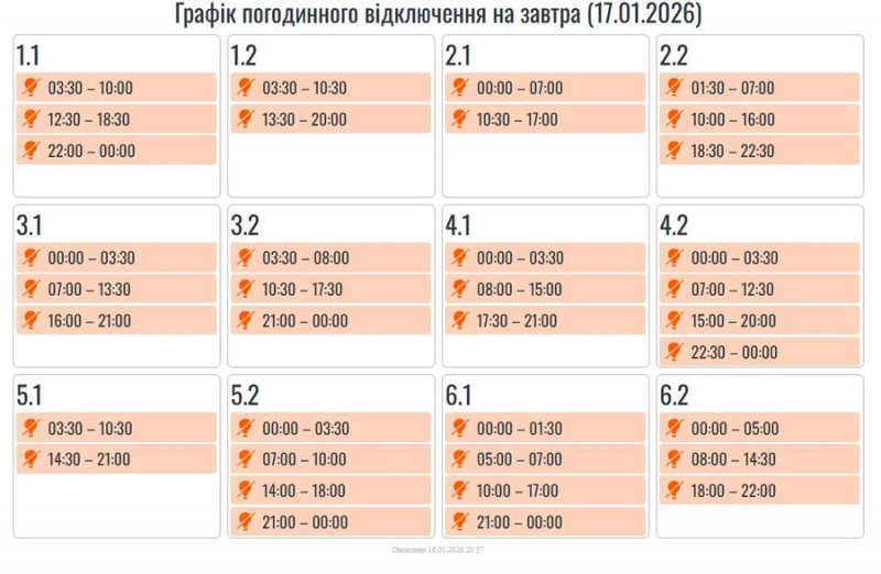 Графіки погодинних вимкнень електроенергії для споживачів на 17 січня. Telegram/Прикарпаттяобленерго