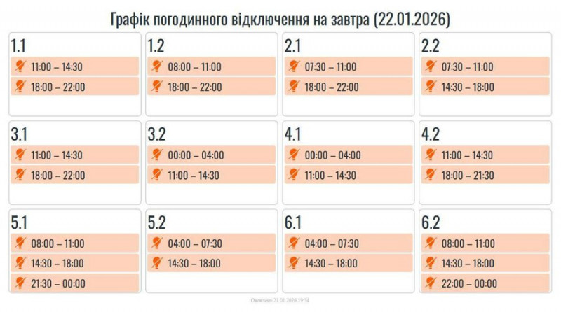 Графіки погодинних вимкнень електроенергії, що діятимуть на Івано-Франківщині 22 січня 2026 року. Прикарпаттяоблаенерго