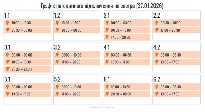 "Завтра, 27 січня, в усіх регіонах України, зокрема на Прикарпатті, будуть застосовуватися графіки погодинних вимкнень", — йдеться у дописі.
