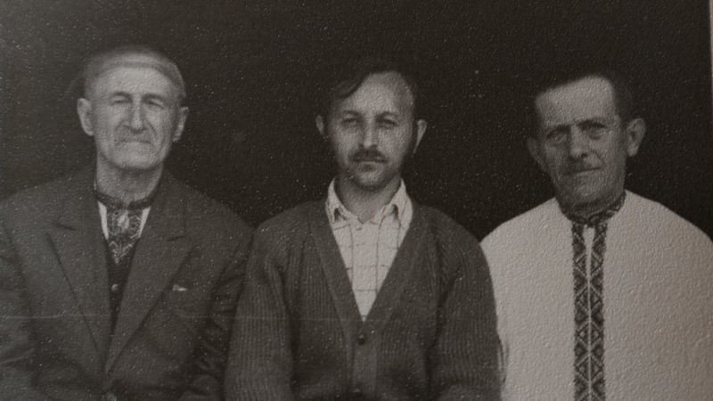 Справа наліво: скрипковий майстер Федір Кравчук з Космача, посередині — його учень Роман Шмігельський. Суспільне Івано-Франківськ