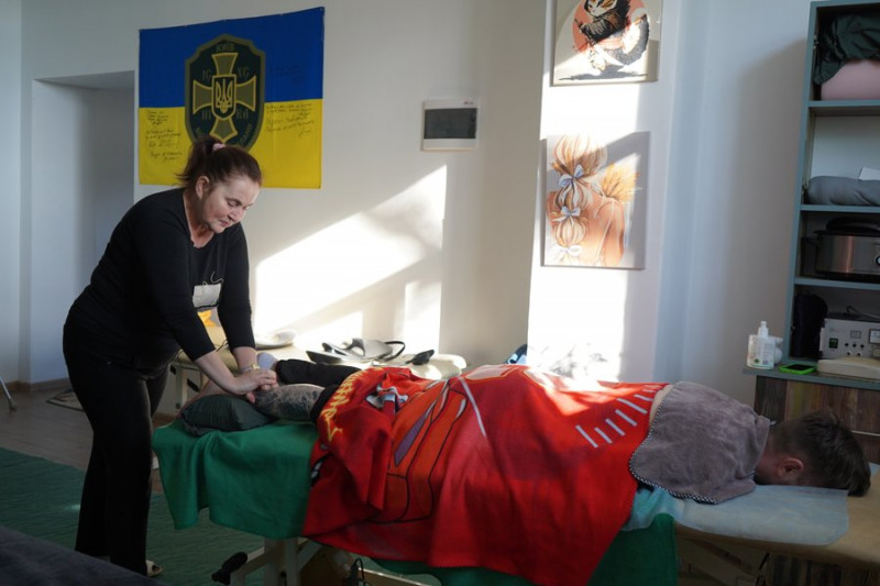 Реабілітологиня Ольга Матковська робить масаж військовослужбовцю Василю Бучицькому. Суспільне Івано-Франківськ/Андрій Москалюк