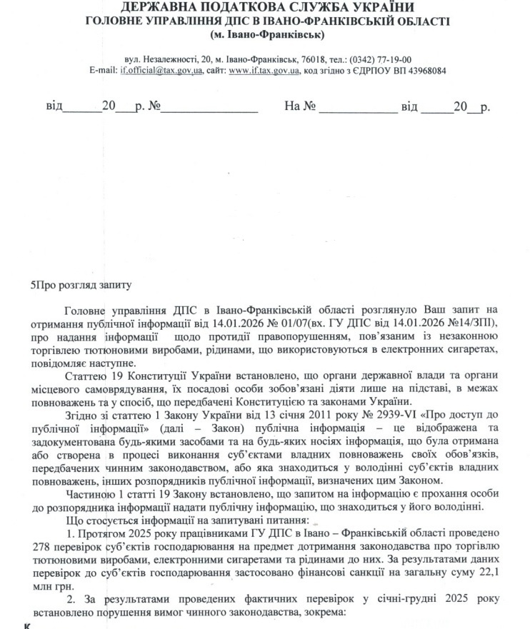 Журналістський запит стосувався протидії незаконній торгівлі вейпами, рідинами та пристроями протягом усього 2025 року.