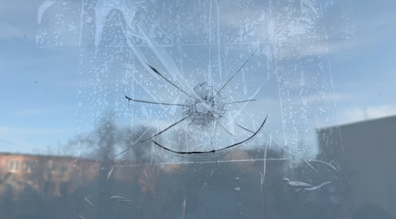 Тріщина від уламку у вікні в Бурштині, 19 листопада 2025. Суспільне Івано-Франківськ