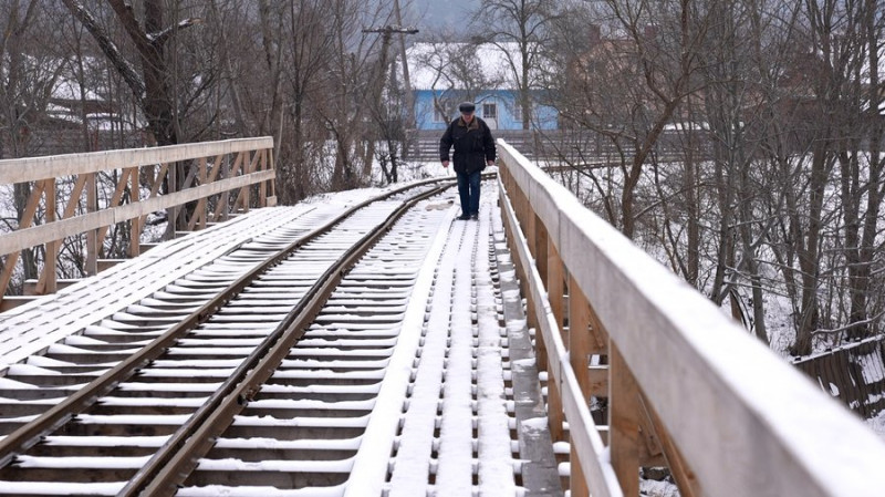 Жителька Нового Мізуня переводить сина через вузькоколійний міст. Суспільне Івано-Франківськ/Роман Кочержук