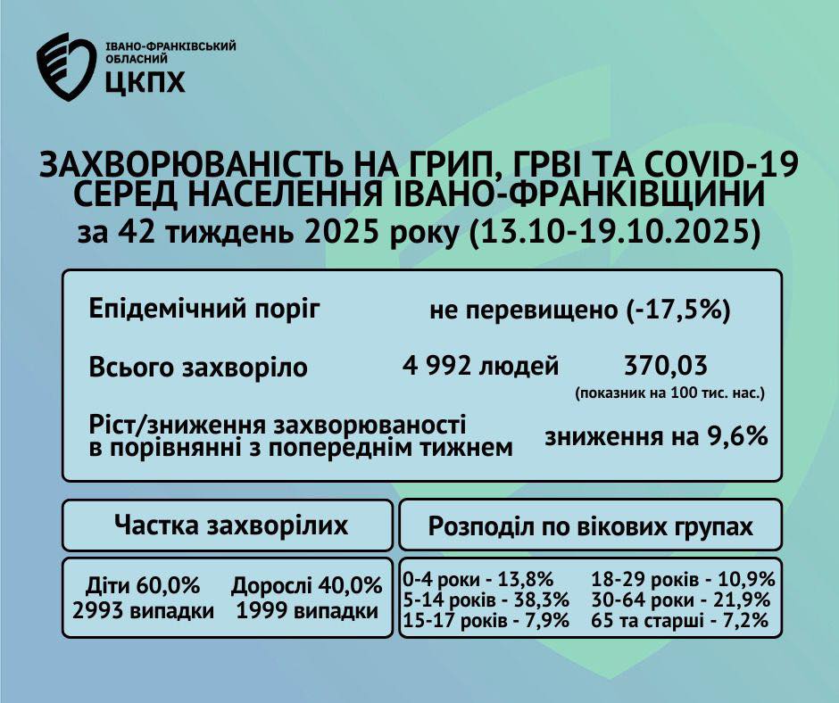 Протягом 42-го тижня 2025 року на Івано-Франківщині на грип, ГРВІ та COVID-19 захворіли 4 992 особи, з яких 2993 — діти віком 0-17 років (60%).