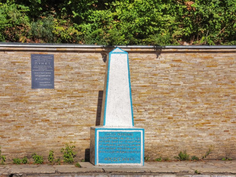 В перекладі вислів звучить так: “Це постійне, точне вічне місце, визначене спеціальним апаратом, виготовленим в Австро-Угорщині, в Європейській системі широт і довгот у 1887 році”.