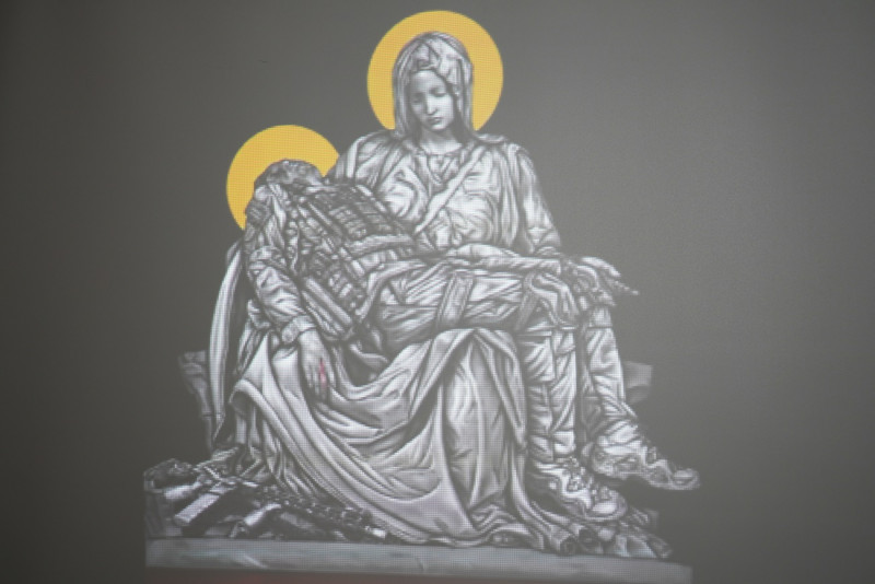 Як розповіла дружина полеглого воїна Сергія Батюка та голова громадської організації "Родини загиблих захисників і захисниць Івано-Франківська" Галина Батюк, їхня делегація представляла "П’єту"Артоб'єкт "П'єта" (Оплакування Христа) — картина заввишки приблизно чотири метри, відтворена за мотивами однойменного твору художника та військовослужбовця Андрія Єрмоленка. На ній написані імена загиблих українських військових у Ватикані, посольстві України в Італії та в Колізеї.