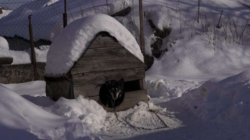 Уночі жінка спускає собаку з ланцюга, аби тварина більше рухалася й у такий спосіб зігрівалася.