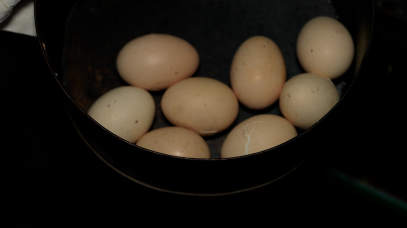 "Хто спробував таке печене яєчко, вже варене більше не вподобає. Для мене це — ідеальне приготування. Сирі яйця ставимо в пательню, і коли там уже нагнітяться наші пасочки, ми з краєчку поставимо і ще спечемо яєчка. Треба дивитися, може і 10 хвилин запікатися — залежить від того, як напечена піч. Зверху на шкаралупі робляться коричневі цяточки. Це означає, що яєчко вже спечене. У кого немає печі, можна спробувати це зробити в духовці", — розповідає Мирослава Волощук.