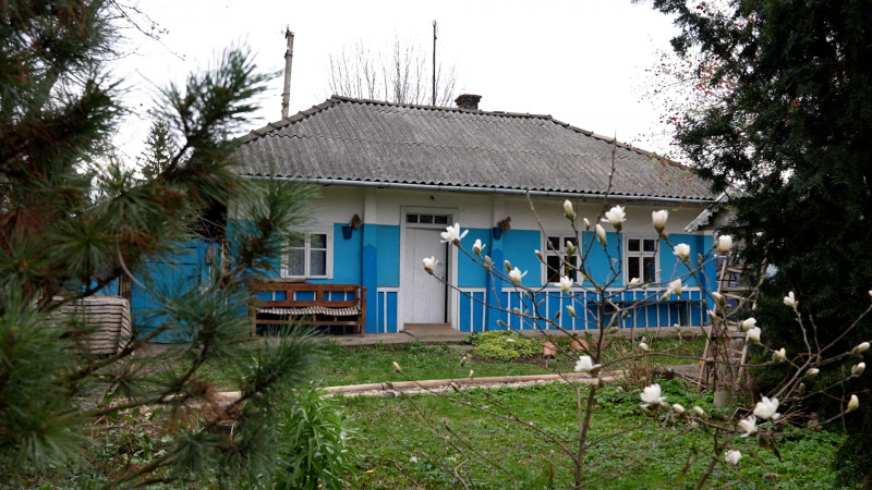 У хаті — дві кімнати та сіниКоридор. Колись там жила велика родина. У попередньої господині Ганни Чорней було четверо сестер: Параска, ДоцяЄвдокія, Маруся і Настя. Їхній батько служив паламарем, а матір була повитухоюЖінка, яка допомагає при пологах.