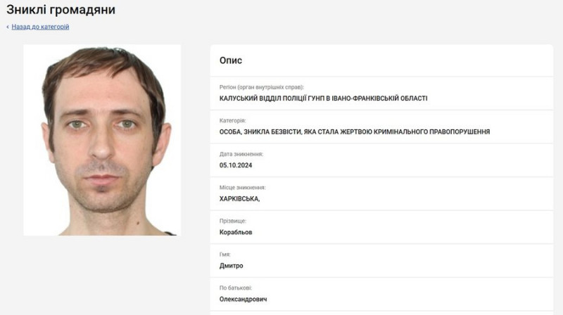 На сайті Міністерства внутрішніх справ України у розділі "Зниклі громадяни" йдеться, що Дмитро Корабльов зник 5 жовтня 2024 року на Харківщині.