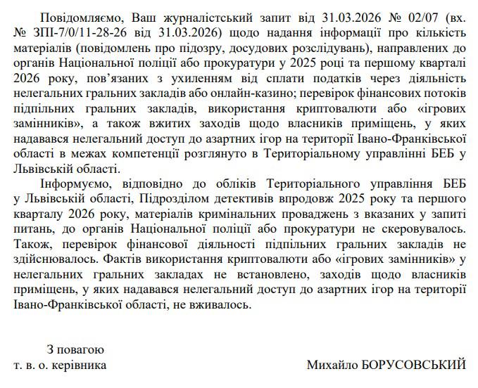 Фіртка також надіслала запит до Територіального управління Бюро економічної безпеки у Львівській області, яке обслуговує й Івано-Франківську область. БЕБ відповіло максимально лаконічно: протягом 2025 року та першого кварталу 2026 року матеріалів кримінальних проваджень, перевірок фінансових потоків підпільних гральних закладів, фактів використання криптовалюти чи заходів щодо власників приміщень на території Івано-Франківської області не було. Перевірок не здійснювалося, фактів не встановлено.