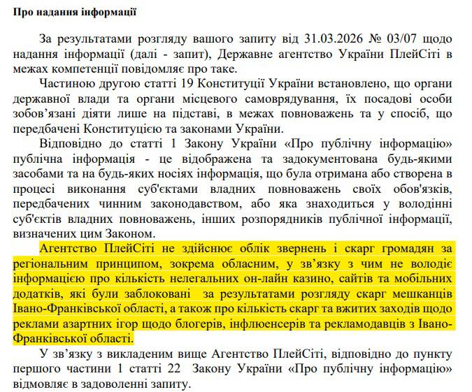Нарешті, ми звернулися до Державного агентства України ПлейСіті, щоб отримати регіональну статистику щодо блокувань нелегальних казино та скарг саме по Івано-Франківській області. Агентство відповіло, що не веде облік звернень і блокувань за регіональним принципом, тому не володіє такою інформацією. Замість конкретних цифр ПлейСіті надало детальний опис загального механізму своєї роботи – моніторингу інтернету, порядку блокування сайтів та штрафів за порушення законодавства про рекламу.