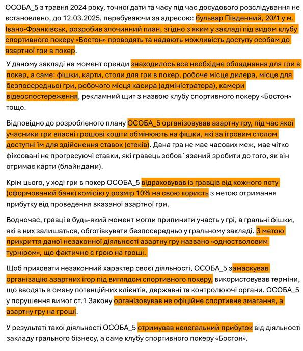 У відкритих судових реєстрах нам вдалося знайти лише один вирок щодо нелегального грального бізнесу на Івано-Франківщині за останні роки. 21 травня 2025 року Івано-Франківський міський суд визнав винним мешканця Галича ОСОБА_5 у вчиненні кримінального правопорушення, передбаченого ч. 1 ст. 203-2 КК України. З травня 2024 по 12 березня 2025 року він організував та проводив азартні ігри в покер на гроші в клубі «Бостон», розташованому за адресою бульвар Південний, 20/1 в Івано-Франківську.