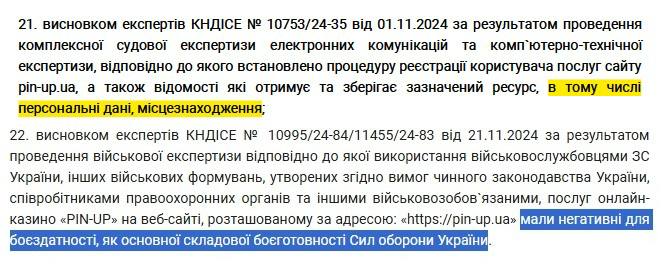 Варто зазначити, що нелегальні онлайн-казино збирають дані про місцеперебування військових-лудоманів, і це загрожує їхній безпеці та операціям на фронті. Нам вдалося отримати судовий документ, де експерти прямо на це вказують: