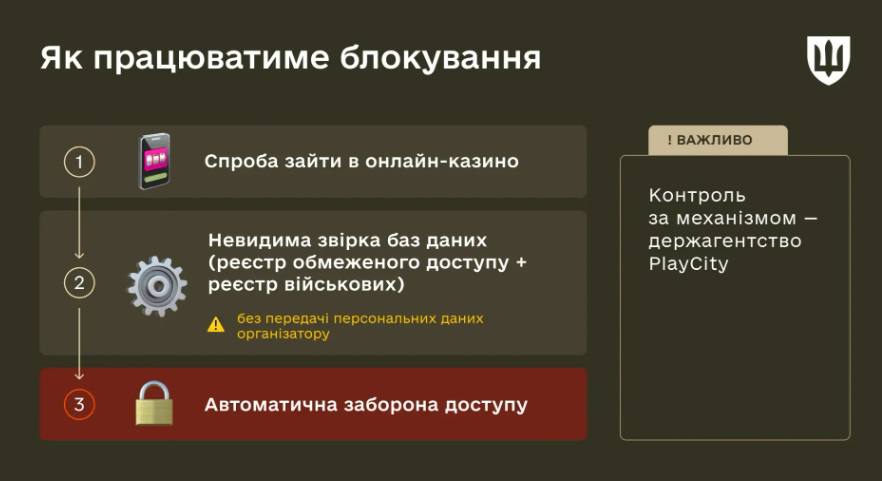 У березні 2026 року Міністерство цифрової трансформації спільно з Міністерством оборони України почали розробляти технічний механізм автоматичного блокування доступу військовослужбовців до азартних ігор. Планується синхронізувати реєстр військовослужбовців з системою грального бізнесу. Доступ має блокуватися автоматично без передачі казино персональних даних. Запуск дослідної експлуатації анонсували на квітень 2026 року.