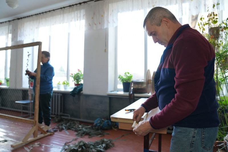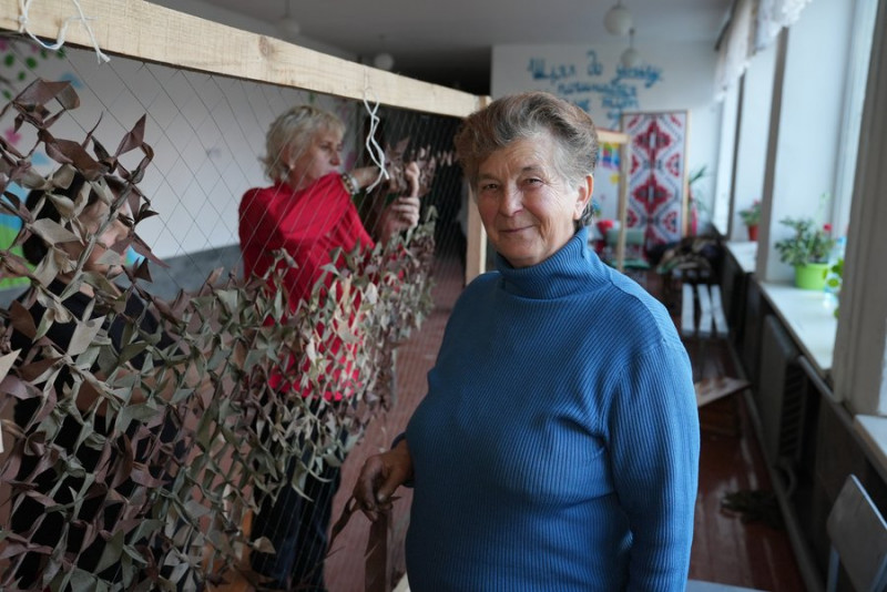 Пенсіонерка Ганна Клюсик приходить плести сітки, щоб відволіктися від переживань за внука, який четвертий рік воює на фронті.