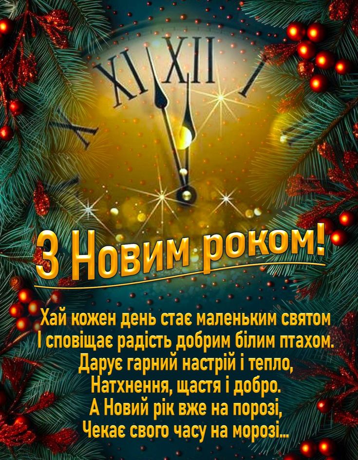 Вітаю з Новим роком! Нехай всі негаразди лишаються у минулому році, не будемо брати із собою сум, невдачі та біди. А візьмемо у рік новий тільки щастя та щиру дружбу, підтримку та посмішки, здоров’я та любов, світлі мрії та добру вдачу! Нехай в цю чарівну новорічну ніч здійсниться найзаповітніше бажання, а рік буде насичений найкращими подіями!