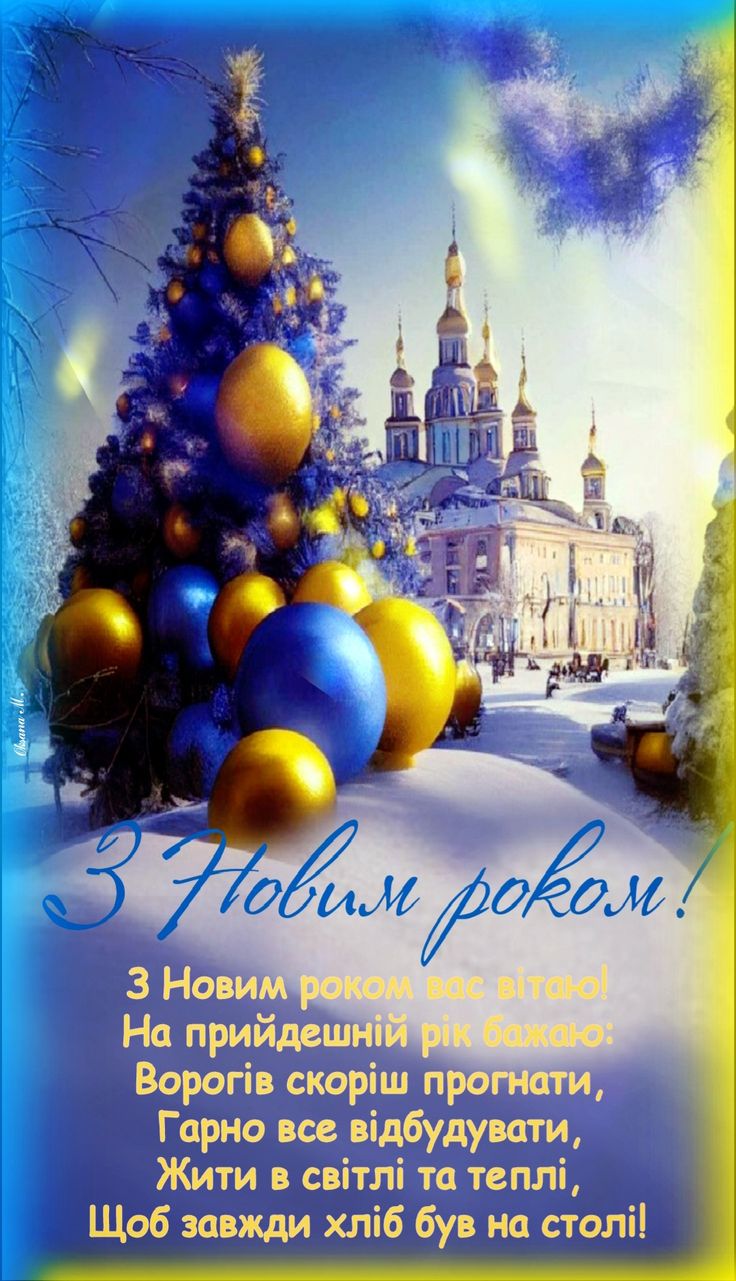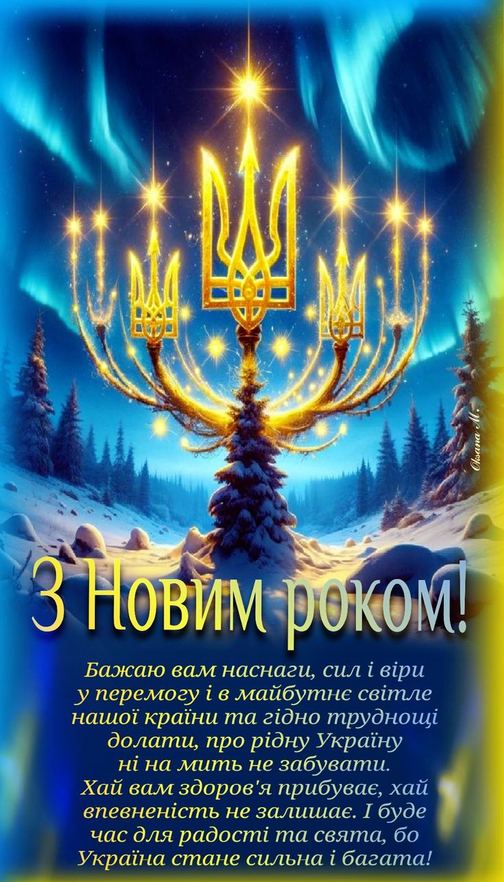 Бажаю вам щасливого Нового року, нехай доля за порогом залишає всі негаразди, а в душі живе віра в мирне життя, добробут, злагоду. Нехай з нової сторінки в ваше життя ввійдуть радість, любов, спокій та перемога.