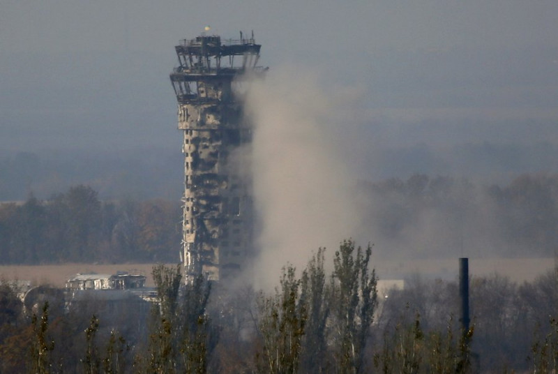 Український прапор майорить над диспетчерською вежею Донецького міжнародного аеропорту імені Сергія Прокоф’єва під час артилерійського бою, 17 жовтня 2014 рік. AP/Dmitry Lovetsky