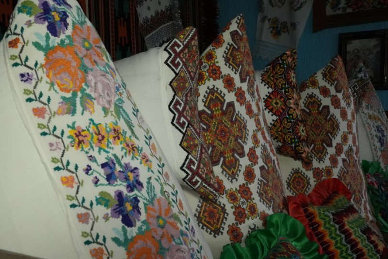 Вишиті подушки в хаті Мирослави Смеречук. Суспільне Івано-Франківськ/Назар Вінтонюк"Навіть взяли в ІванівціСело у Коломийському районі до клубу, в музей. Я вже так тепер дивлюся та й думаю: сама не вірю, що я це все робила", — каже вишивальниця.