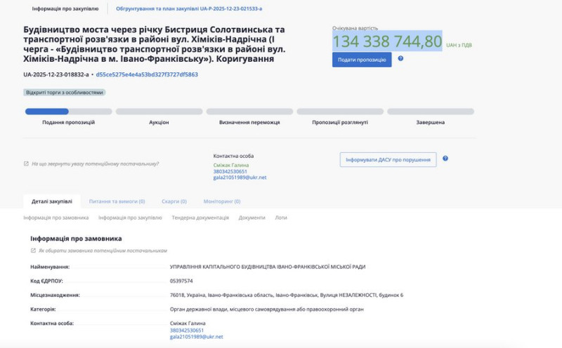Тендер на будівництво моста на Пасічну та транспортної розв’язки в районі вулиць Хіміків-Надрічної. Скриншот з Prozorro