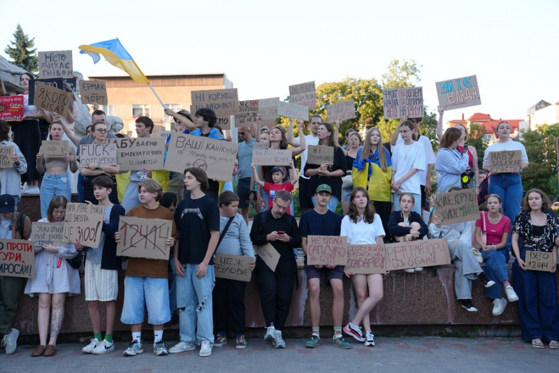 Учасники акції-протесту проти закону № 12414, який ліквідовує незалежність НАБУ і САП. Івано-Франківськ, 23 липня 2025 року. Суспільне Івано-Франківськ/Діана Яців