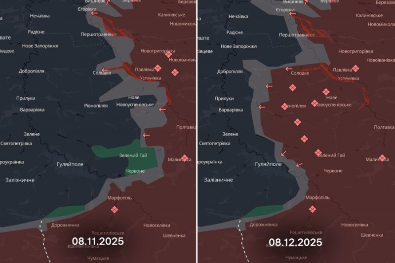 Як змінилася ситуація на Гуляйпільському напрямку за місяць (з 8 листопада по 8 грудня 2025 року). DeepState